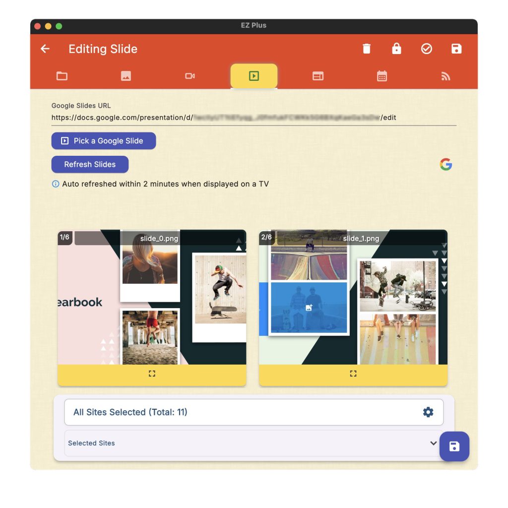Connect the right presentation in seconds. When you create a Google Slides slide in the EZTV portal, click Pick a Google Slides to browse your Drive (including shared Drives), select the deck, and you’re set—no copy‑pasting links.
